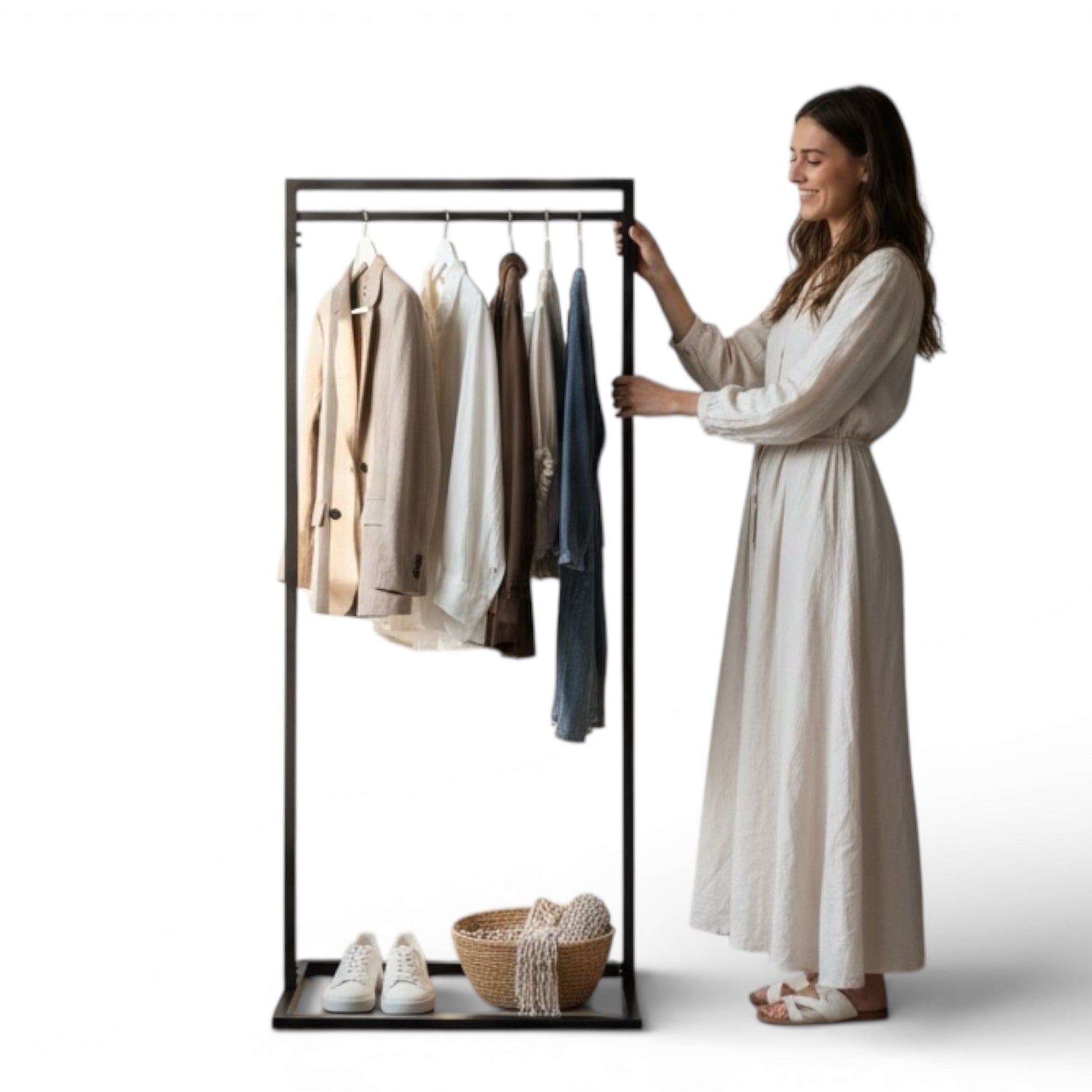 . Stabilt og enkelt tøjstativ med en højde på 140 cm, velegnet til både bukser og bluser. Det rammeformede design giver et roligt og overskueligt udtryk i butikken og passer godt ind, hvor der ønskes et klassisk look,.