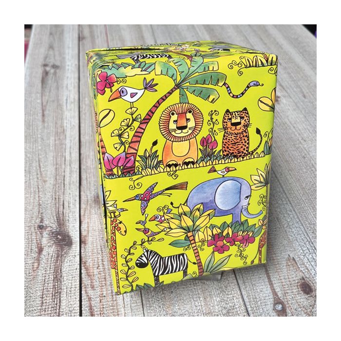 Indpak dine gaver i et festligt gavepapir med farverige mønstre af Afrikas majestætiske dyr. Dyremotiver der skaber glæde og eventyr. Lime grundfarve på hvid coated papir. 80 gr. Mål: Bredde 57 cm x 150 mtr. Se også gaveposer i farver