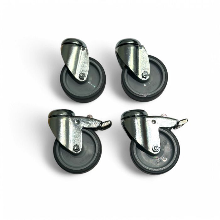 Inkl.. bolte, møtrikker, skiver til montering. HUSK: at angive, hvilket stativ hjulene skal passe med. 2 hjul m/bremse -2 hjul u/bremse