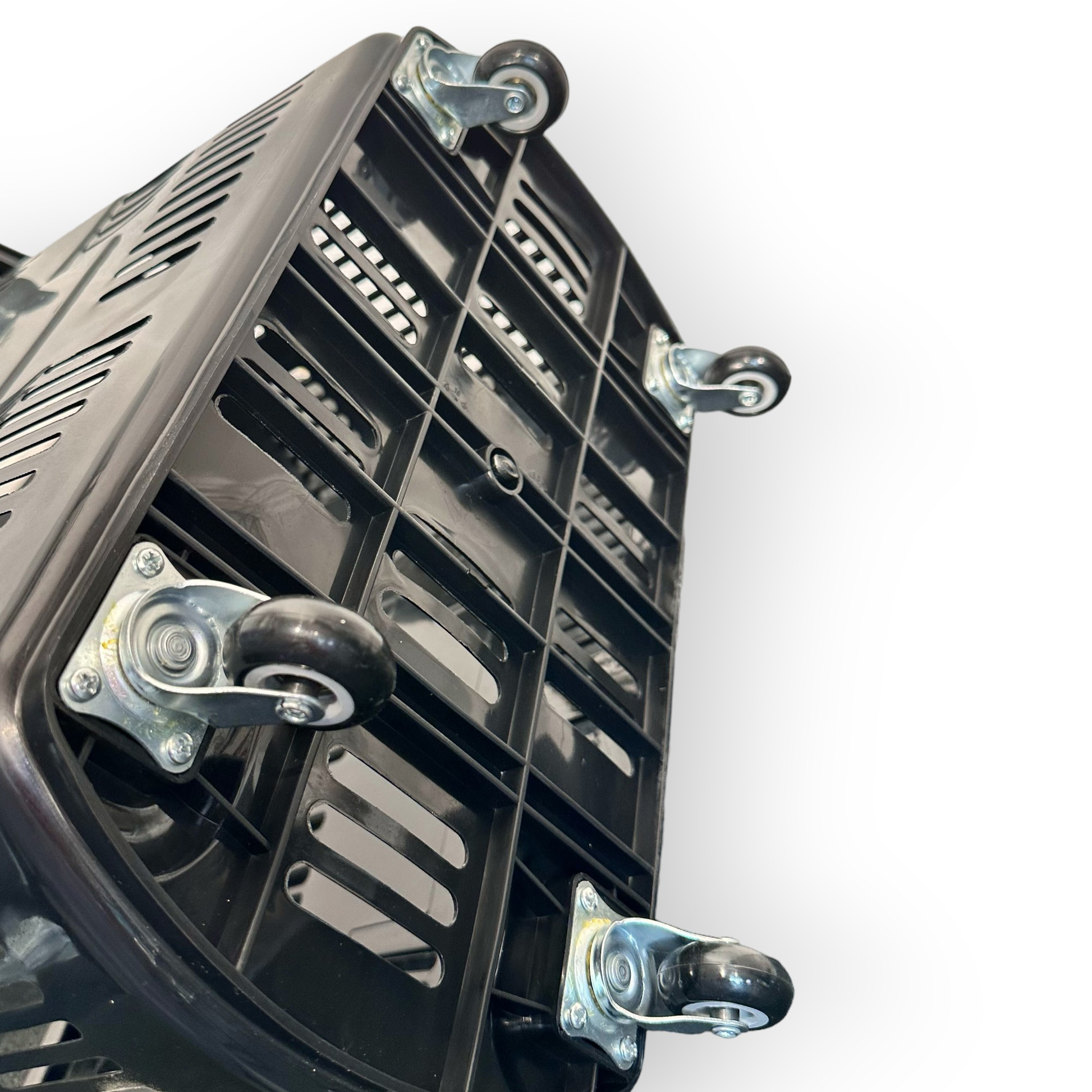 Denne rummelige indkøbskurv kan indeholde op til 55 liter. Kurven har to forskellige håndtag. Den kommer også med 4 små gummihjul( drejbar) og trækhåndtag. Der gør det let at manøvrere rundt i butikken. Mål: B43 x D65 x H46 - Inkl. håndtag H 101 cm. Der mål B33 x D52 x H38, 4 hjul. Sort plast