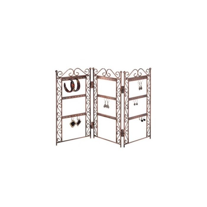Dette smukke kobberfarvede ørestiks-display er en perfekt måde at præsentere op til 36 par øreringe på. Displayet har tre fløje og er ideelt til at fremhæve dine øreringe i butiksvinduet eller på en udstillingsdisk. Med en bredde på 26 cm og en højde på 45 cm er dette display både elegant og praktisk og vil helt sikkert tiltrække opmærksomhed fra dine kunder. Op til 36 ørestikker. H45 cm.