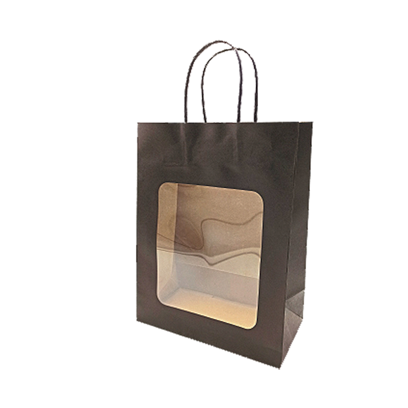 Stor papirpose med snoet håndtag. Vindue med afrundet hjørner. Perfekt til en eksklusiv indpakning. Papirposen kommer pakket med 20 stk. B 21,5 x D 10,5 x H 27,5 cm. Sort / brun kraft papir. Findes også i en mindre udgave.