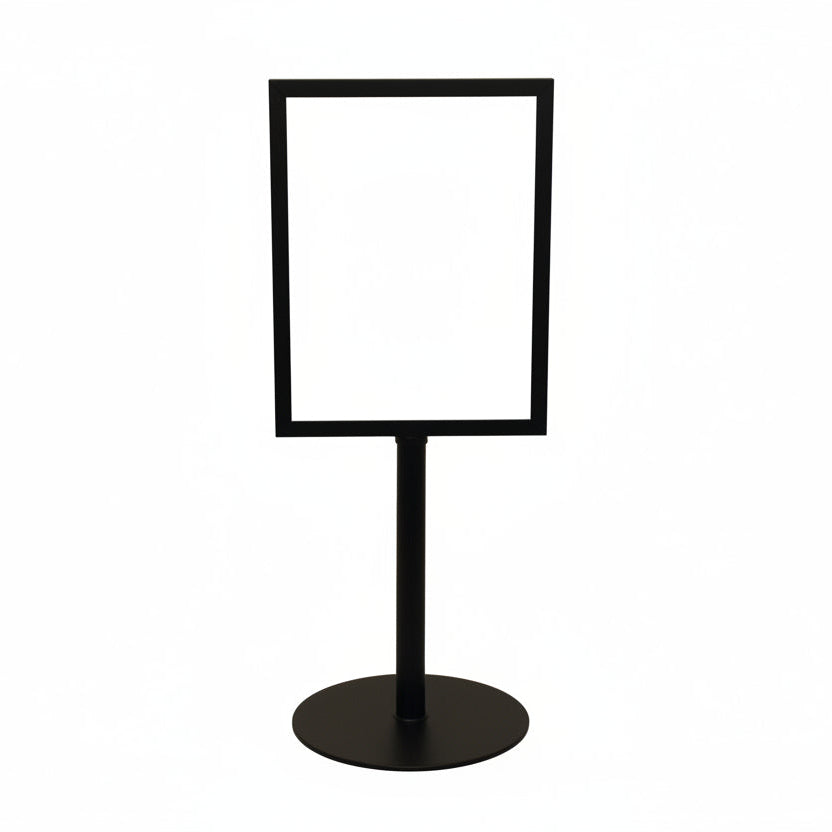 Vores klassiske menukortholder i metal på en solid rund metalfod. Vores menu- eller skilteholder er velegnet til enhver form for skiltning. Uanset om det er lamineret skilt, skilt med plastlommer, papir eller pap, kan det indsættes i vores menukortholder. Foden har en fast højde på 19 cm, men den kan forhøjes med op til 15 cm ved tilkøb af en forlænger. Vi anbefaler også at tilkøbe plastlommer til at beskytte papirskiltet mod slid og snavs. Den galvaniserede model er særligt velegnet til udendørs salgsborde, hvor den tåler forskellige vejrforhold.