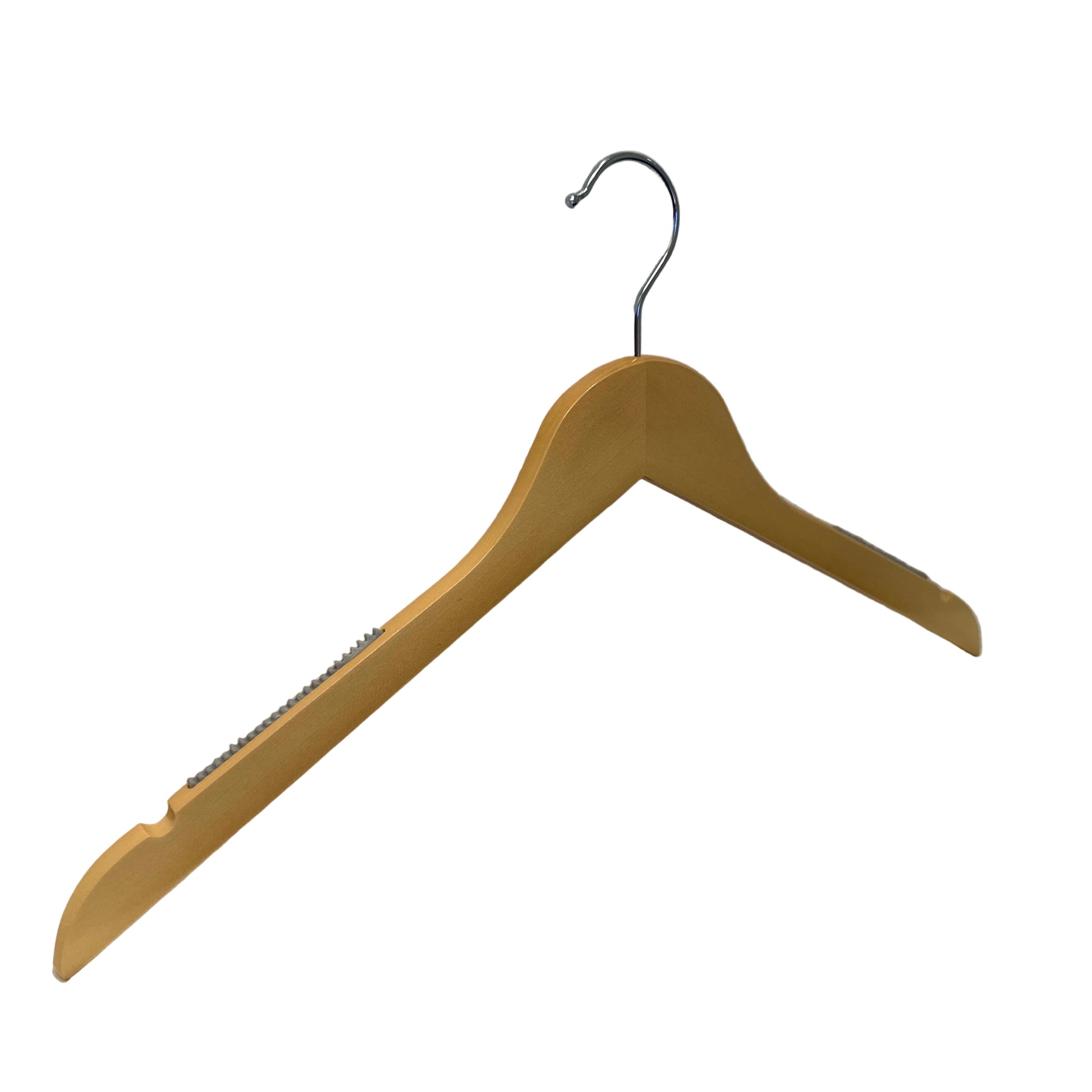 Træbøjle, massiv, flad, voksen, med gummi og hak, uden stang, lysere natur, 12 mm tyk, 45 cm.