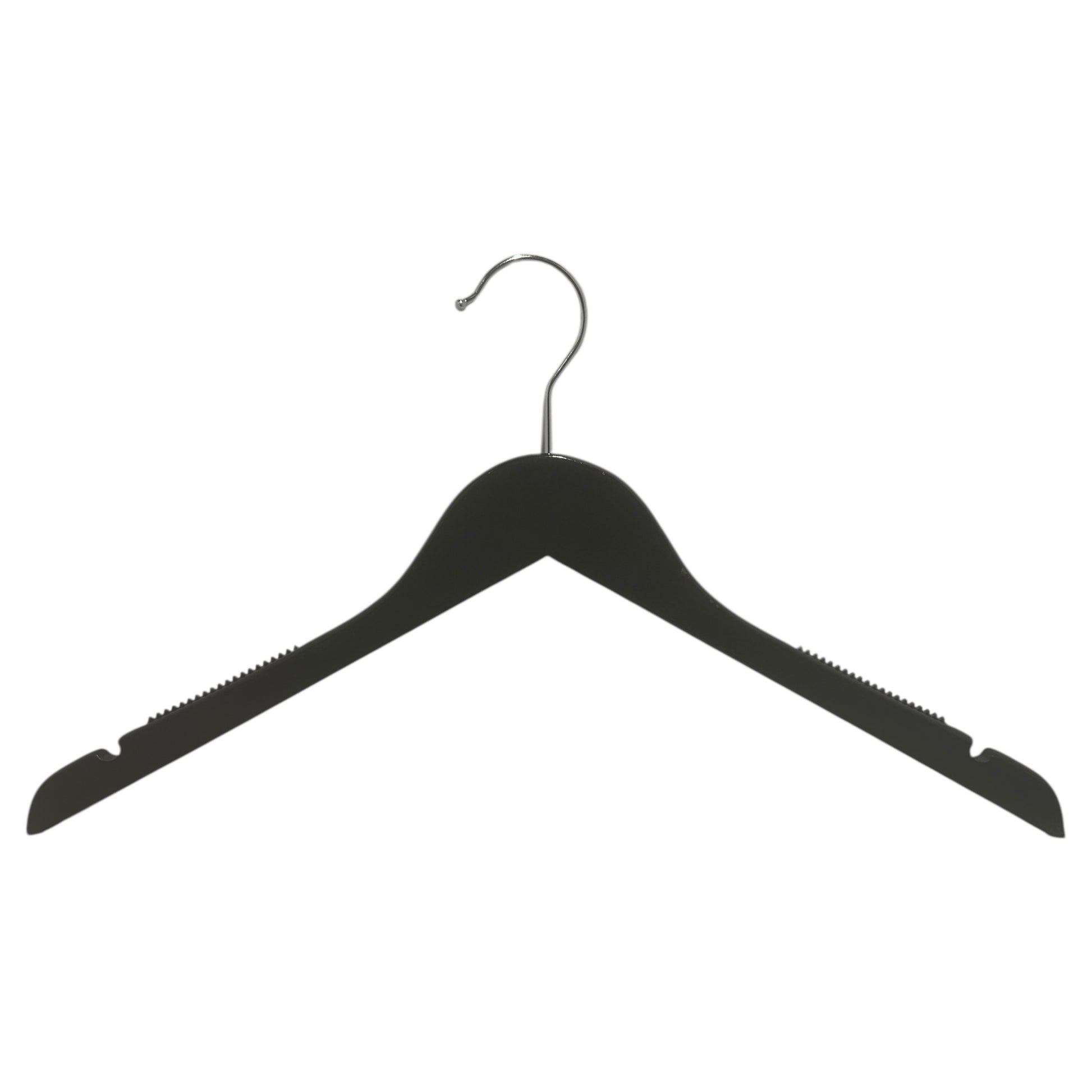 Træbøjle, massiv, flad, voksen, med gummi og hak, uden stang, sort, 12 mm tyk, 45 cm