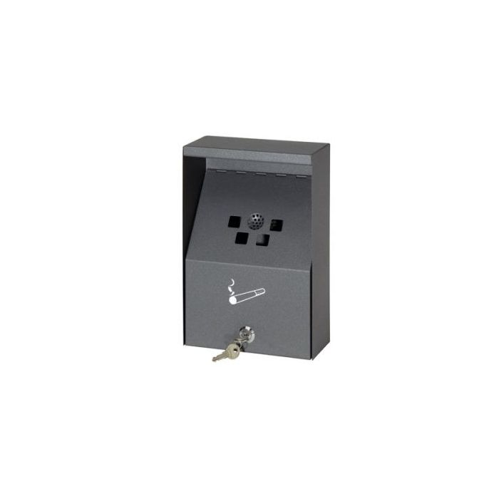 Udendørs askebæger Gråmalet metal og med lås. Drypbakke indeni. Kan også anvendes indendørs. Højde 28 cm Bredde 18 cm Dybde 8 cm