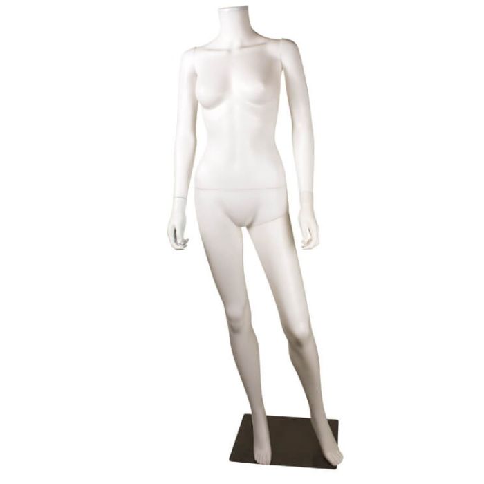 Naisten mallinukke ilman päätä, suorilla käsillä. Edullinen mallinukke, jota voi käyttää monenlaisille tuotteille näyttelyssä. Mallinukke toimitetaan nelikulmaisella metallisella jalustalla. Siinä on sekä jalka- että pohjapiikki, joten nukelle voi laittaa kengät. Helppo käsitellä messuilla ja näyttelyissä. Mitat: Korkeus: 162 cm. Rinta: 82 cm Vyötärö: 61 cm Lantio: 89 cm Jalka: 23 cm.