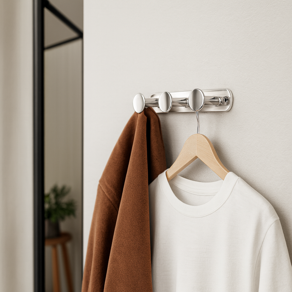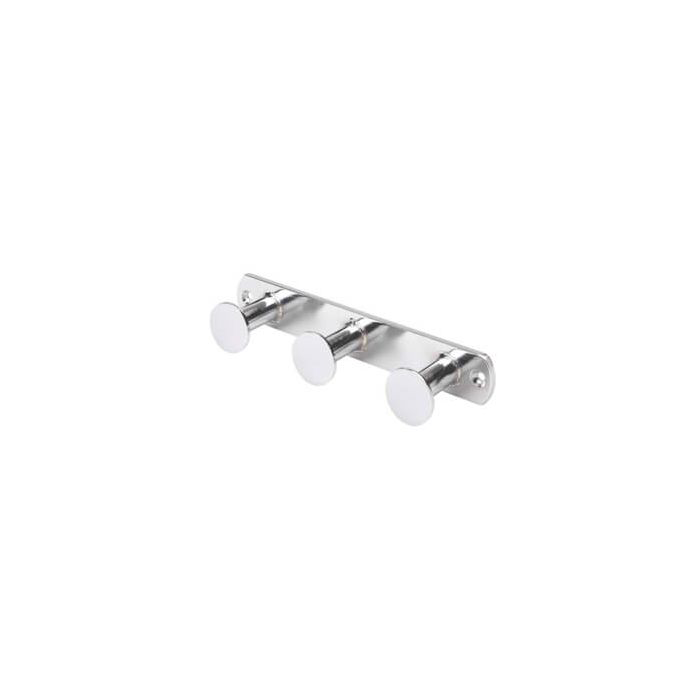 Vaatekoukku, jossa 3 ripustinta näytetilaa ja sovitushuonetta varten. Sitä voidaan käyttää myös esittelyyn tai tiskin takana. Koukun kiinnitys tapahtuu kahdella ruuvilla ja tarvittaessa raw plug -ankkureilla riippuen seinätyypistä. Ruuvit ja raw plug -ankkurit eivät sisälly. Mitat: L 19,5 x S 4,5 x K 3 cm. Kromi.