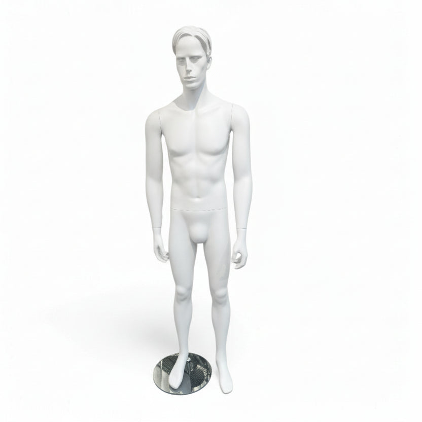 Miesten mallinukke, jossa kasvonpiirteet ja veistetty hiusmuotoilu – antaa elävämmän esityksen. Mallinukke toimitetaan jalustalevyllä. Siinä on sekä säärinasta että jalkanasta, mikä mahdollistaa jalkineiden esillepanon. Mallinukke on lasikuitua ja mukana on pyöreä lasinen jalustalevy. Mitat: Korkeus 186 cm. Rinta 97,5 cm. Vyötärö 77 cm. Lantio 94 cm. Jalka 27 cm. Valkoinen lasikuitu. Pyöreä lasinen jalustalevy.