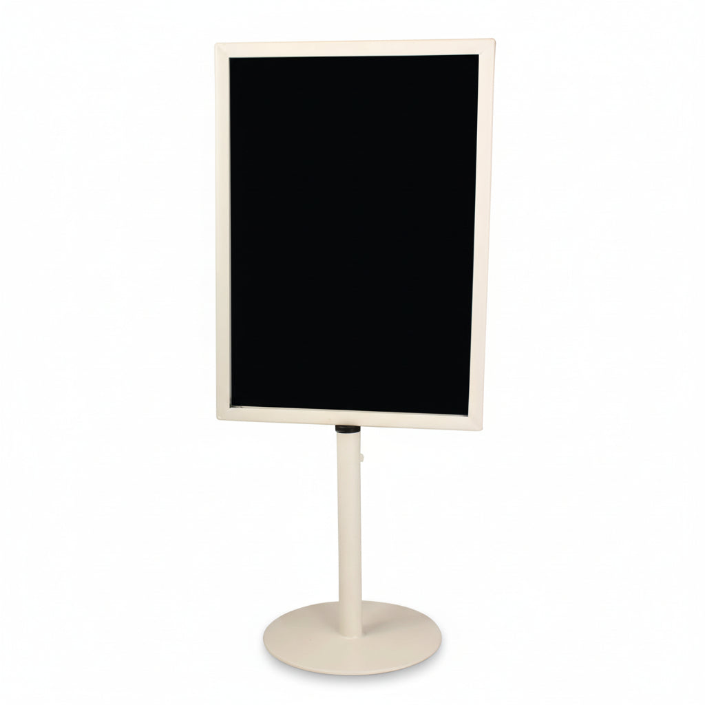 Klassinen metallinen menu-/kyltinpidike tukevalla pyöreällä metallijalalla. Menu- tai kyltinpidike soveltuu kaikenlaiseen kyltitykseen. Oli kyse laminoidusta kyltistä, muovitaskullisesta kyltistä, paperista tai kartongista, se voidaan asettaa pidikkeeseemme. Jalan korkeus on kiinteä 19 cm, mutta sitä voi korottaa jopa 15 cm lisähankittavalla jatkeella. Suosittelemme myös muovitaskujen hankkimista suojaksi paperikyltin kulumista ja likaantumista vastaan. Galvanoitu malli on erityisen sopiva ulkokäyttöön myyntipöydille, sillä se kestää erilaisia sääolosuhteita.