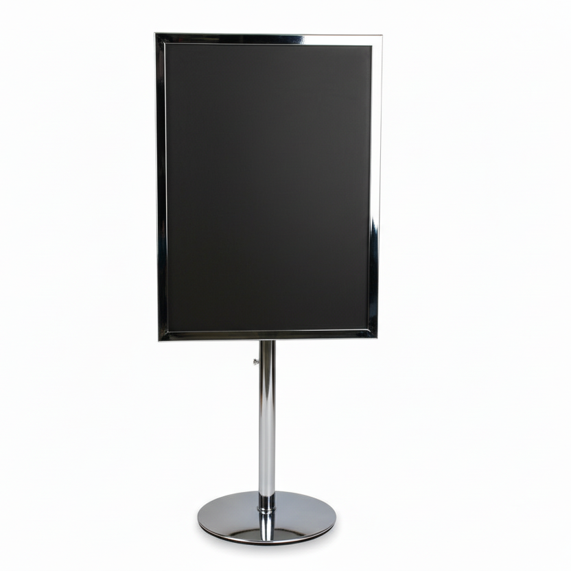 Meidän klassinen metallinen menukortinpidike vankalla pyöreällä metallijalustalla. Menukortti- tai kyltinpidikkeemme sopii kaikenlaiseen kyltitykseen. Olipa kyse laminoidusta kyltistä, kyltistä muovitaskuilla, paperista tai pahvista, se voidaan sijoittaa menukortinpidikkeeseemme. Jalustan korkeus on kiinteä 19 cm, mutta sitä voi korottaa enintään 15 cm ostamalla jatkopalan. Suosittelemme myös muovitaskujen hankkimista paperikyltin suojaamiseksi kulumiselta ja lialta. Galvanoitu malli soveltuu erityisesti ulkokäyttöön myyntipöydillä, sillä se kestää vaihtelevia sääolosuhteita.