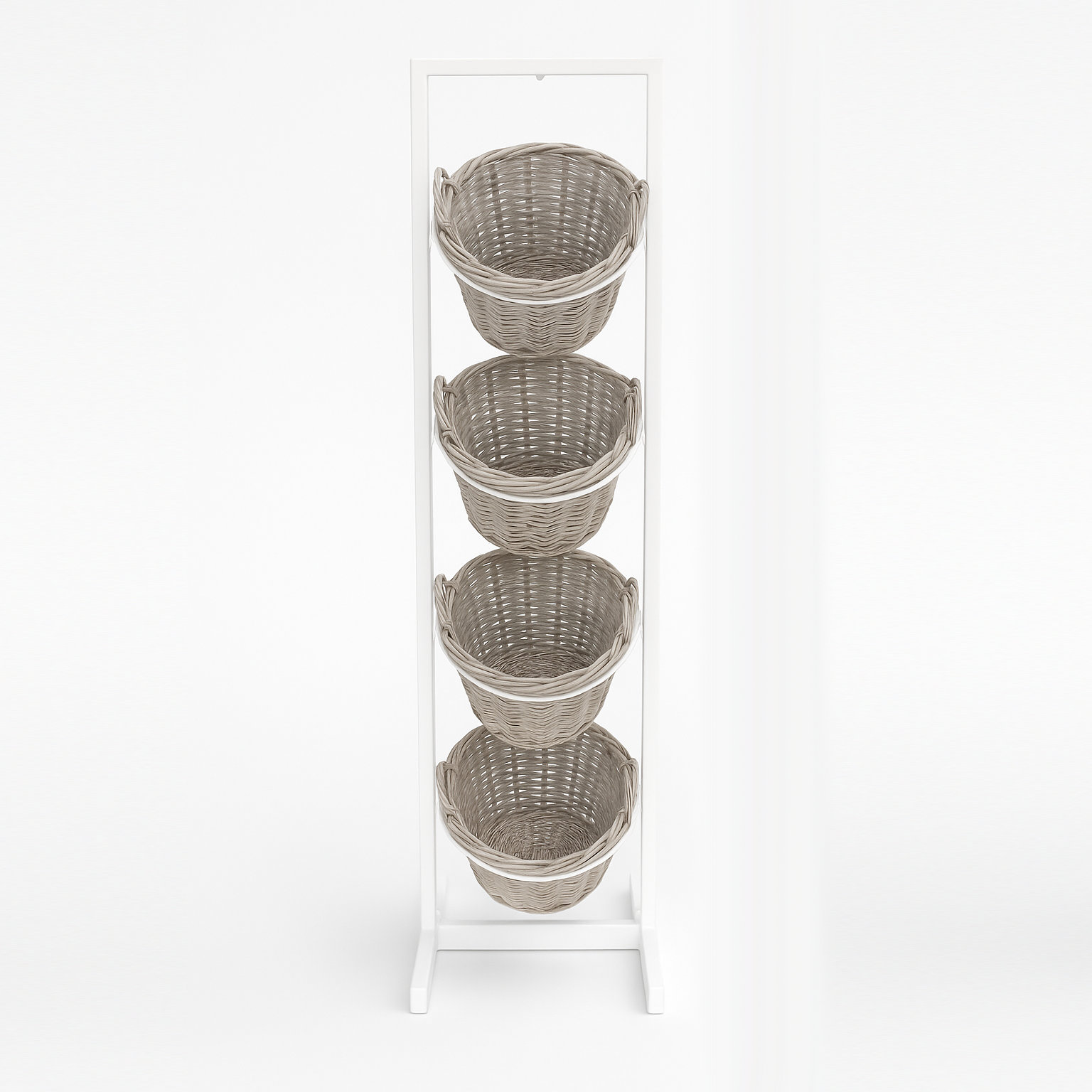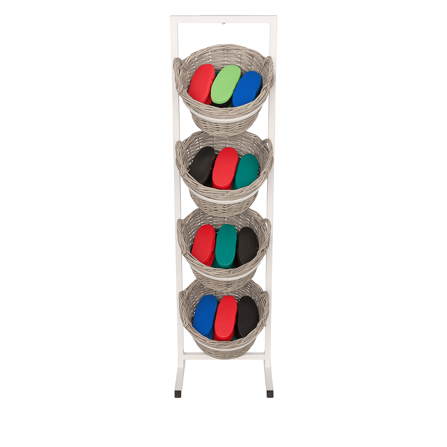 Korikisko, jossa on 4 koria tuotteillesi. Mahdollisuus A4- tai A3-mittaiseen metallikilpeen yläosassa. Korikisko toimitetaan säätöjalkojen kanssa. Pyöräsarja on saatavilla lisävarusteena, jotta telineen siirtäminen ja puhdistus olisi helpompaa. Mitat: L 45 x K 173 cm. Jalka: L 45 x S 40,5 cm. Kori on kuluneen näköinen, tyyliltään yhteneväinen Heritage-inventaarisarjamme kanssa. Koriin kuuluu muovinen sisäosa. Sisäosa on kiinnitetty pienellä langalla, joka voidaan helposti poistaa.