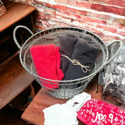Metallinen lankakori kahvalla. Tyylikäs valinta lattialle tai hyllylle laitettaville tuotteille. Ø 40 cm.