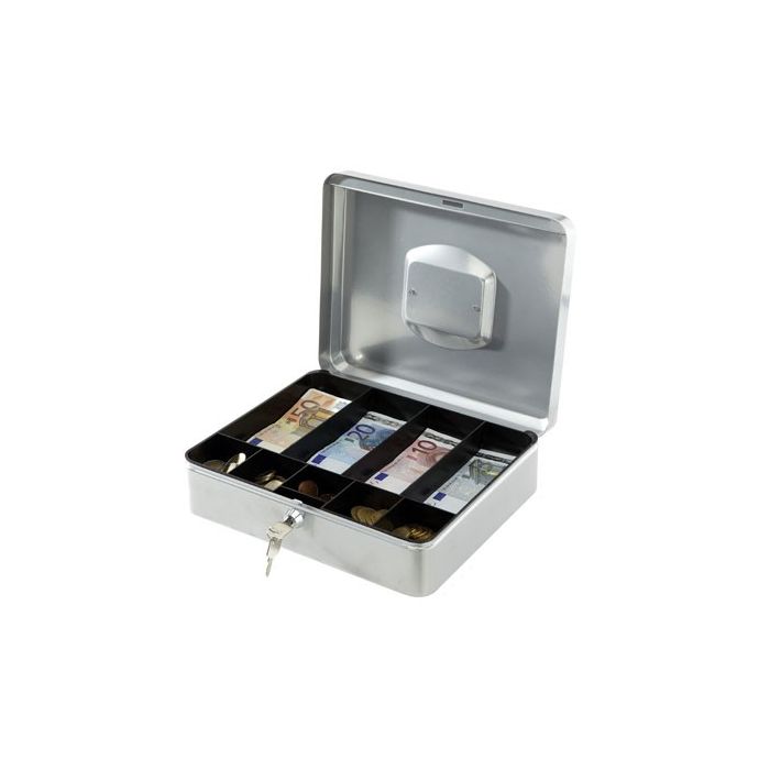 Rahakassi on metallia ja siinä on kahva kannessa sekä 1 siirrettävä lokero. Lokero on muovia ja siinä on 5 osaa kolikoille ja 4 osaa seteleille. Rahakassi on myös lukolla varustettu, 2 avainta sisältyy. Mitat: 30 x 40 x K 9 cmHarmaa2 avainta